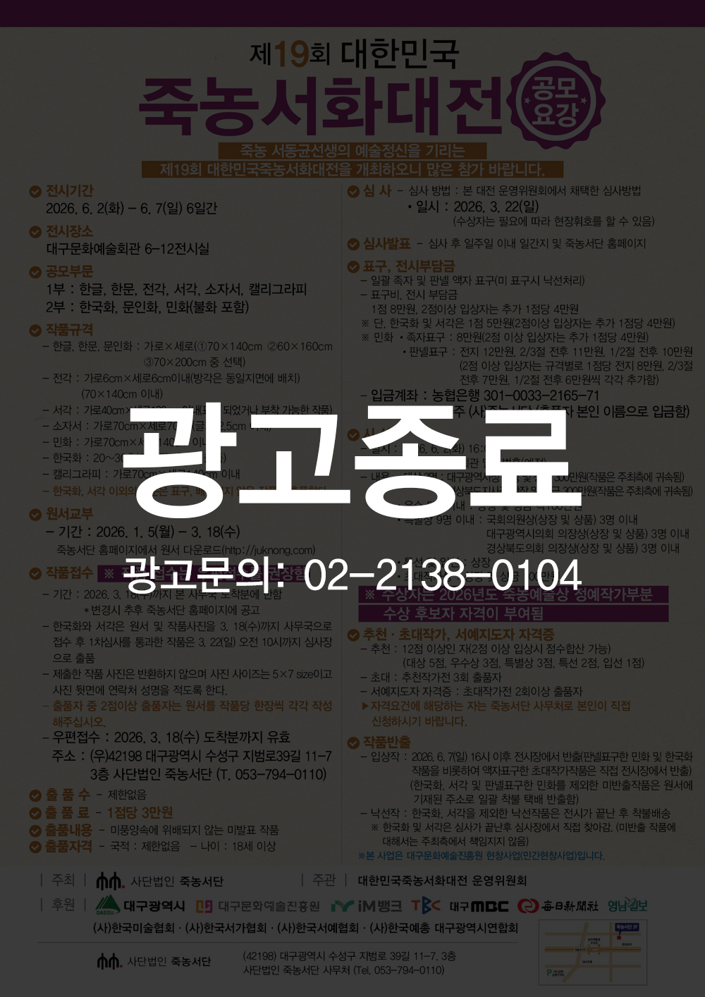 제19회 대한민국 죽농서화대전 공모요강 / 접수 01.05-03.18 |