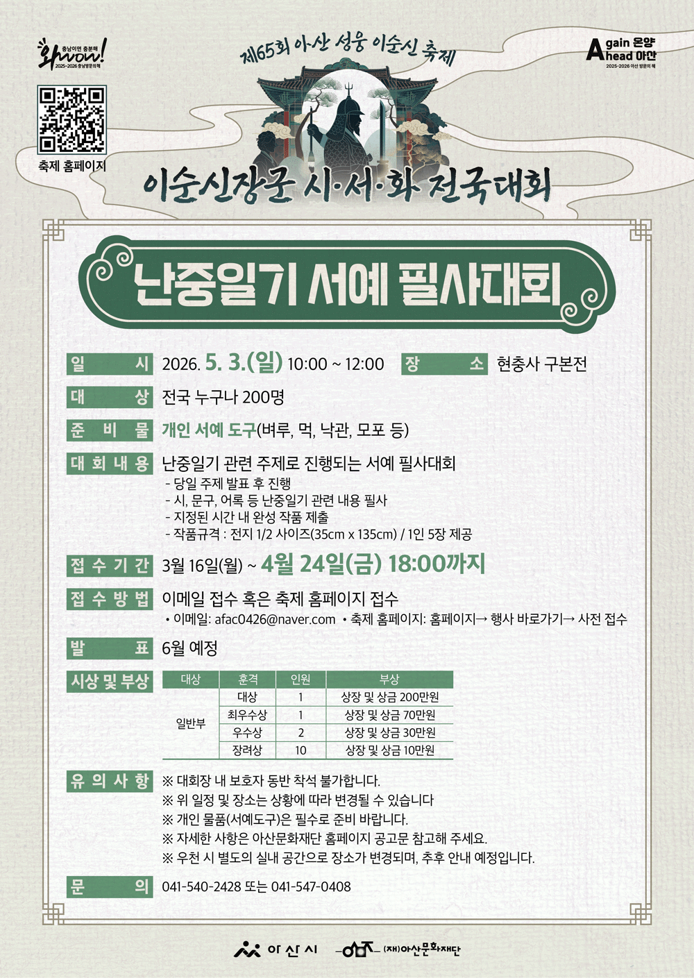 제65회 아산 성웅 이순신 축제 <난중일기 서예 필사대회> / 접수 3.16-4.24 |