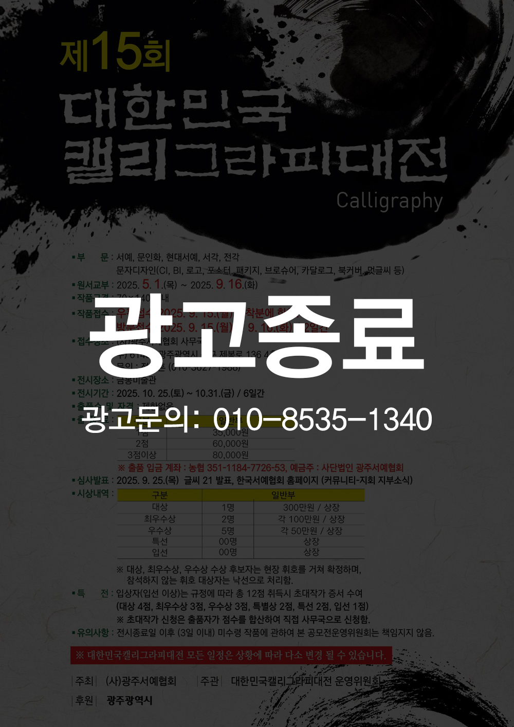 제15회 대한민국 캘리그라피대전 & 제5회 학생서예대전 / 접수: ~9.16 |