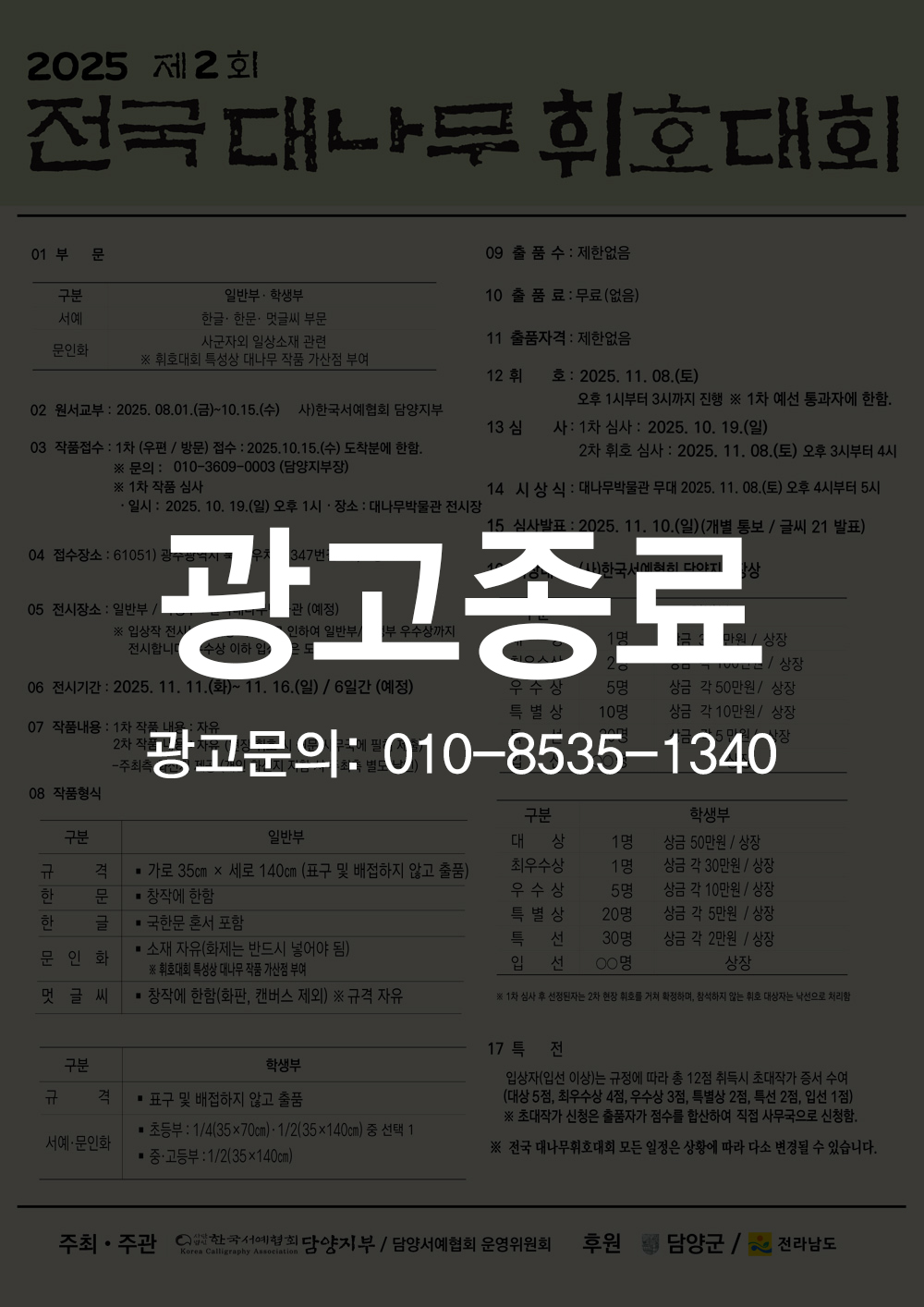 제2회 전국대나무휘호대회 / 접수: 8.01~10.15, 문의: 한국서예협회 담양지부 |