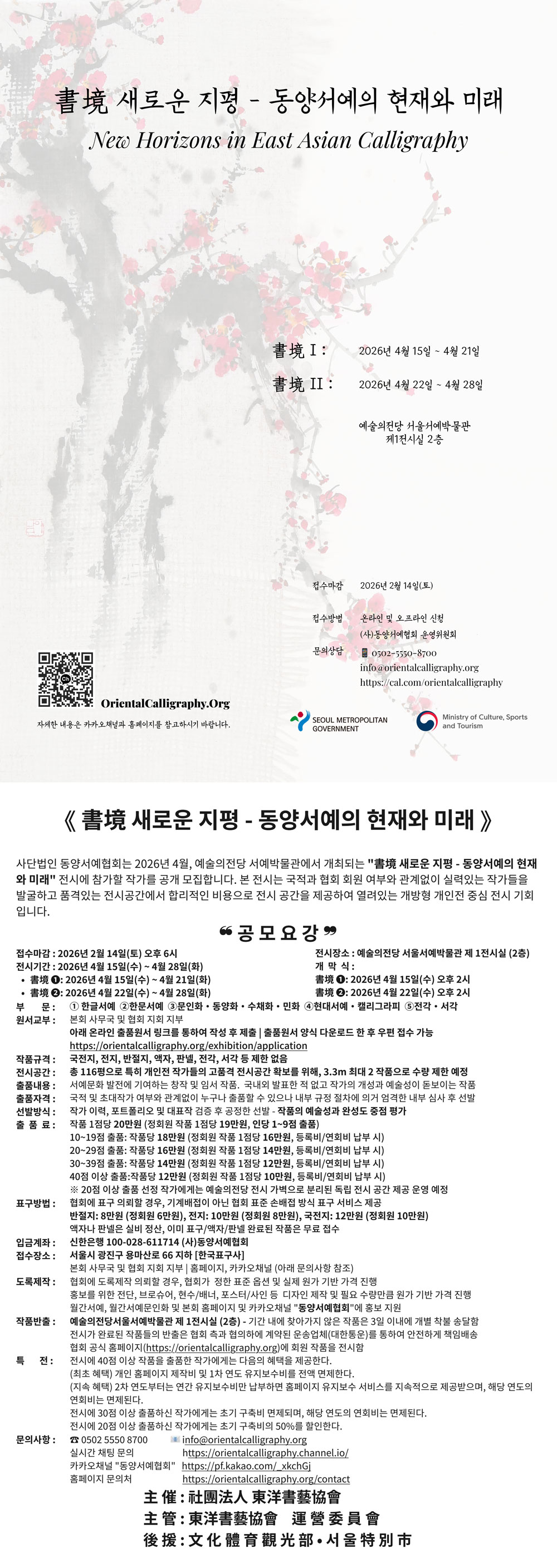 사단법인 동양서예협회는 2026년 4월, 예술의전당 서예박물관에서 개최되는 “書境 새로운 지평-동양서예의 현재와 미래” 전시에 참가할 작가를 공개 모집합니다. 본 전시는 국적과 협회 회원 여부와 관계없이 실력있는 작가들을 발굴하고 품격있는 전시공간에서 합리적인 비용으로 전시 공간을 제공하여 열려있는 개방형 개인전 중심 전시 기회입니다.